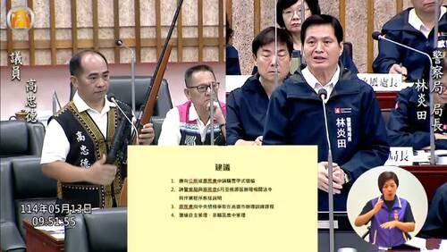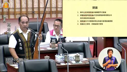 他也問到原民槍枝的管理,是集中?還是自主管理?警察局長林炎田表示,由持有著自己決定是自己保管或是集中管理,尊重當事人的意見。但自主管理必須家裡設有槍櫃、警鈴與監視器。高忠德建議市府做好狩獵槍枝的管理、訓練與盤檢。
