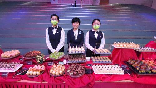 在會場的兩邊,服務生打扮的外場學生排排站,目視著前方,仔細觀察著每位賓客的動向,而在後排的展攤區,同學們料理的各式糕點與冰品,已準備就緒,就等著家長們的品嚐。
