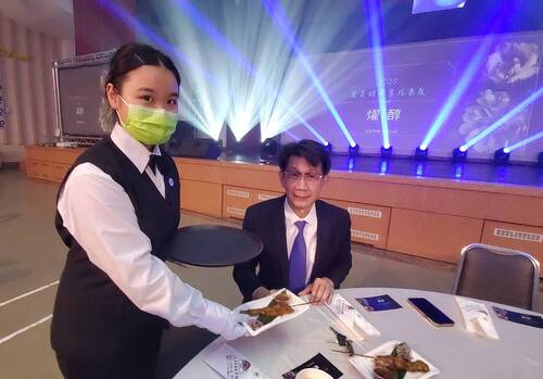 今天的活動,有餐桌上的美食,還有舞台上的精彩演出,除了邀請兩科高三畢業學生家長,還有業界產學聯盟飯店代表,與策略聯盟大學教授、主管,共同來見證學生們三年學習的成果。