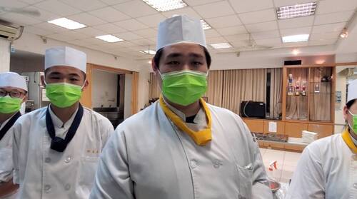 在內場的廚房,廚師打扮的餐管科學生已經用心做好了料理,並將前菜的南洋沙嗲,一份一份擺進了盤子,同學們都抱持著興奮的心情,準備大試身心,讓爸爸媽媽好好品嚐他們的好手藝。