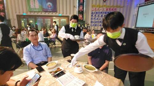 走進立志高中活動中心地下三樓的大禮堂,迎面而來的是穿著制服的餐管科學生進行的外場服務,一句歡迎光臨,拉近了與賓客的距離,隨後引導入座,親切體貼的服務,也讓家長們感受賓至如歸。