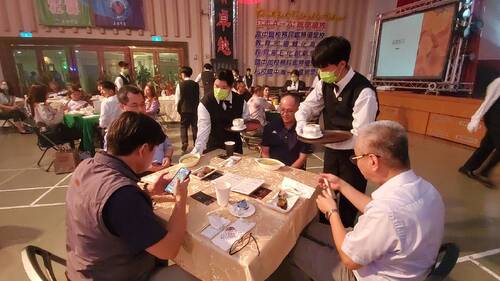 隨後,主持人開場的出菜秀,外場服務的同學們端著第一道前菜的南洋沙嗲,一個接著一個進入會場,並將手中的盤子端上各個餐桌,為每位賓客進行桌邊服務。於是今晚精彩的晚會活動,也宣告正式「啟動」。