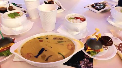 在餐飲方面,餐管科學生們精心料理了前菜南洋沙嗲,主菜南洋綠咖哩雞,及搭配各式的南洋特色甜點及飲料,如泰式奶茶、摩摩渣渣及香茅綠茶…等南洋風味的美食饗宴,色香味俱全,並搭配上菜秀與甜點秀,成功征服所有賓客的味蕾。