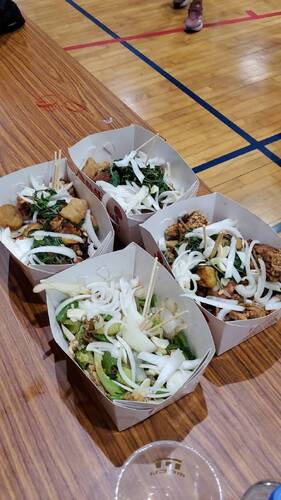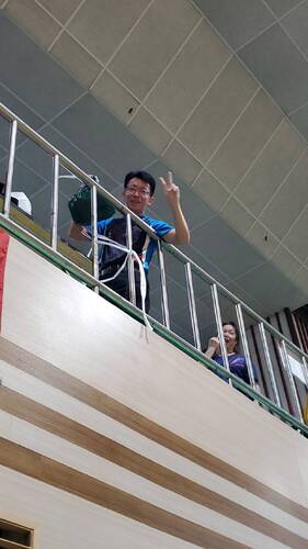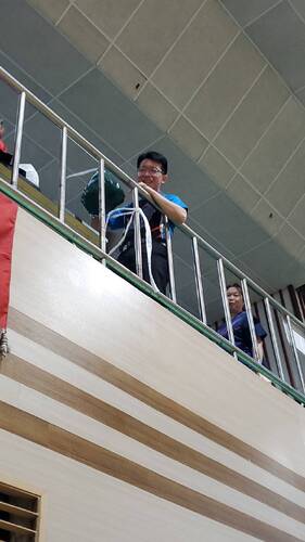 值得一提的是,在下午的等候時間,鳳西國中校方也準備了許多吃食、飲料,特別是好吃的鹽酥雞,來慰勞辛苦的師長們,沒想到香氣飄到了樓上的明義國中考生服務區,校長洪自強拿出了用橡皮筋串成的繩子,直接從活動中心二樓看台放下繩子,請鳳西國中直接把鹽酥雞放在袋子綁在橡皮筋繩子上「輸送」,沒想到橡皮筋超有彈性,無法拉起,而不到幾秒鐘,洪校長又「變」出了一條塑膠的白色繩子,就這樣,在大家齊聲高喊「加油聲下」,整盒的鹽酥雞就這樣被吊到了二樓看台的明義國中考生服務區。