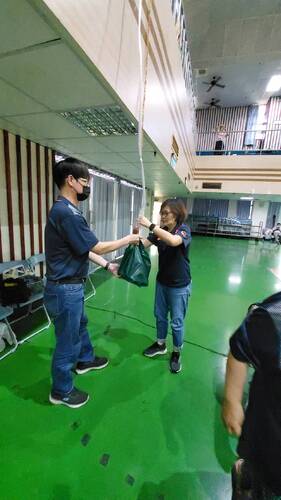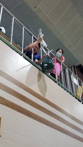 鳳西國中被吊走了一盒的「鹽酥雞」,明義國中也很有禮貌的「禮上往來」,裝上一些飲料,再把飲料慢慢往下送,這樣一來一往,也成為學校師長服務考生「漫長陪考」中的輕鬆「有趣畫面」。