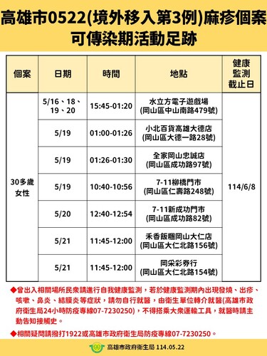 【漾新聞記者陳雯萍/高雄報導】高雄市今(22)日通報新增一例境外移入麻疹確定病例,為今年第三例。患者為30多歲本國籍女性,曾於5月2日至8日前往越南旅遊,返國後於5月16日出現頭痛、肌肉痠痛等症狀,5月20日出現紅疹後隔日就醫,經通報後確診,目前在負壓隔離病房接受治療。由於其從事服務業,接觸對象眾多,且曾在可傳染期間於高雄岡山區多處公共場所活動,引發防疫關注。