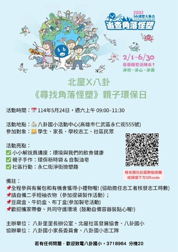 【漾新聞記者陳雯萍/高雄報導】高雄市八卦國小今(24)日上午舉辦「尋找角落怪塑親子環保日」,由師生攜手八卦里與北屋社區發展協會共同出擊,凝聚親子、學校與社區力量,實地走入街區清理垃圾,為地球減塑盡心力。這是學校響應慈心有機農業發展基金會「點亮台灣,點亮海洋」計畫第七年的重要行動,也是首次與社區深度合作的環保教育實踐。
