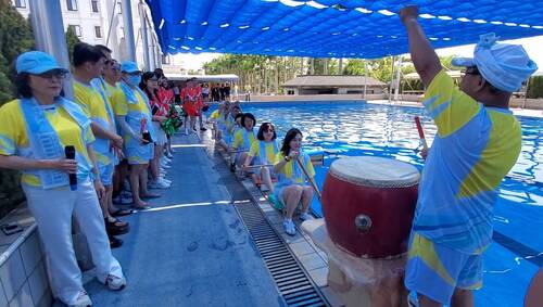【記者陳雯萍高雄報導】高雄市府會龍虎鬥即將於端午節的2025愛河龍舟嘉年華會再度上演,高雄市議會議員、幹部同仁組成的龍舟代表隊與啦啦隊,今天(27日)下午在烈陽下,由議長康裕成帶領進行水上操兵,康裕成「我們的秘密武器就是議會內的游泳池,讓同仁們就近操演。」對於目前的對抗實力,她說:不能說,不能讓市長知道,但我們有信心拿冠軍第一名,勝利在望!