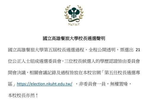 對於今天發生的「媒體爆料」新聞,校方也發聲明表示:「國立高雄餐旅大學校長遴選聲明-國立高雄餐旅大學第五屆校長遴選過程,全程公開透明,票選出21位公正人士組成遴選委員會,三位校長候選人的學歷認證皆由委員會開會決議,相關會議記錄及過程皆放在本校官網『第五任校長遴選專區』https://election.nkuht.edu.tw/ 非委員會一員,無權置喙,本校校長亦然!」
