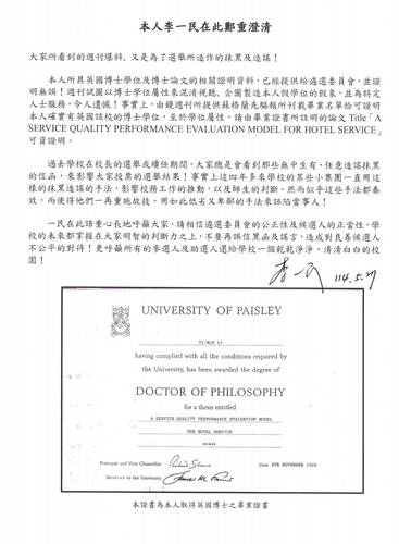 並強調:「本證書為本人取得英國博士之畢業證書」