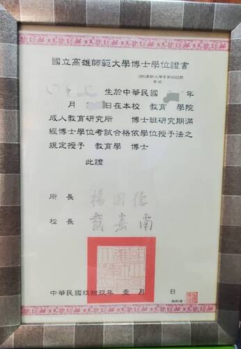 在符合大學要求的所有條件後,憑藉題為《旅館服務品質績效評估模型》的論文被授予博士(PhD)學位