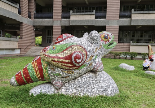 明義國小位於小港機場航道下,長年受飛機噪音干擾,「鎮音獸」駐守校園已有20年,是文化部校園公共藝術的一部分,由李億勳教授打造。