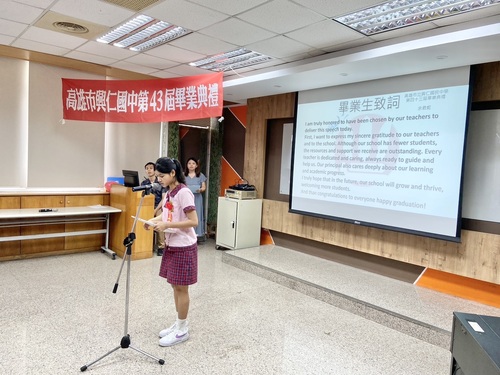 畢業生代表余君妮以全英文致詞,感謝興仁國中三年來師長的用心指導,並表示雖然學校人數不多,但資源卻很充足,也希望彼此友誼能長久延續。余君妮今年榮獲3Q達人與AQ達人優選,表現亮眼,令人讚賞。