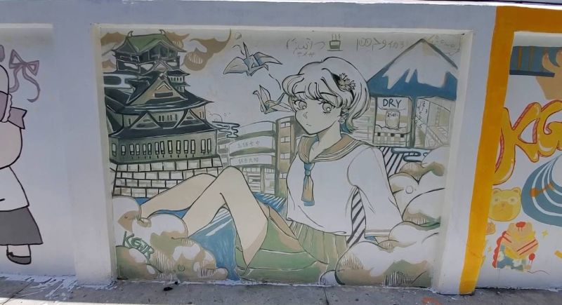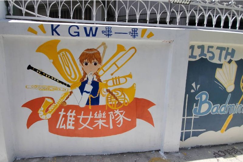 其中,日本文化研究社以日據時期雄女校服為主角,搭配大阪城、道頓堀與富士山等背景元素,展現文化交融意象。學生說:「這次作品不只在網路曝光,而是實際展示在校門外,路人與居民都能看見我們的心血,真的很有成就感。」