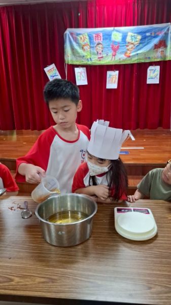 在顏靖芳、蕭惠恩、吳程因三位老師引導下,孩子們透過觀察、比較與創作,從感官體驗轉化為語言表達與動手實作。活動靈感取自韓國節目《黑白大廚》,三組孩子分別負責「鹹」味鮪魚肉鬆玉米飯糰、「酸」味蜂蜜檸檬冰、「甜」味蜂蜜煉乳鬆餅,從備料、介紹到烹調全程參與,自信介紹料理步驟並親手端上桌,化身專業小小大廚。