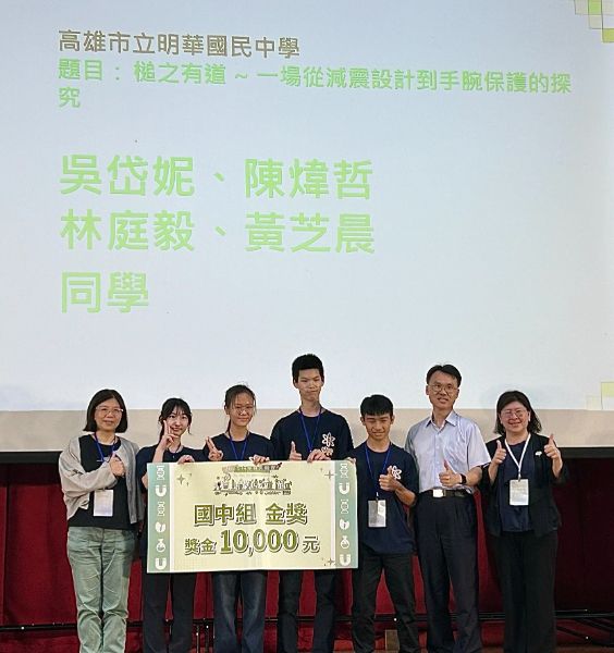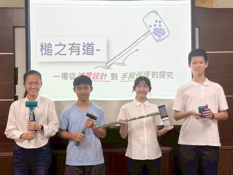 此次競賽每組僅有6隊進入決賽,競爭激烈。明華國中4隊全數入圍決賽,作品涵蓋工程設計、食品實驗、生活科學與農產分析等領域。其中由吳岱妮、陳煒哲、林庭毅、黃芝晨組成的團隊,作品「槌之有道~一場從減震設計到手腕保護的探究」,以創新角度分析槌子結構與顆粒移動自由度對減震效果的影響,整合揮擊角度與握柄設計,兼顧敲擊力與舒適性,榮獲全國第一名。指導老師吳德儀、李冠徵表示,孩子們不僅動手實作,還展現高度實證精神,實至名歸。