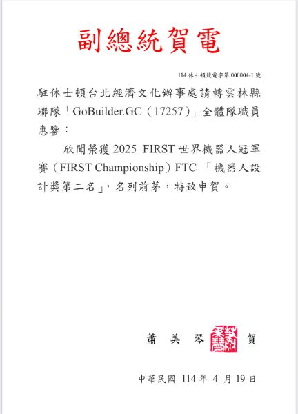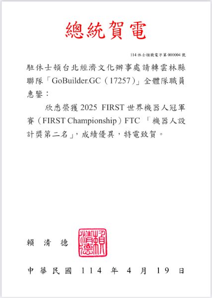 比賽期間,聯隊也獲得駐休士頓辦事處處長蕭伊芳親自探視,並轉頒總統賴清德與副總統蕭美琴的賀電,肯定學生們用創意與科技讓世界看見台灣。