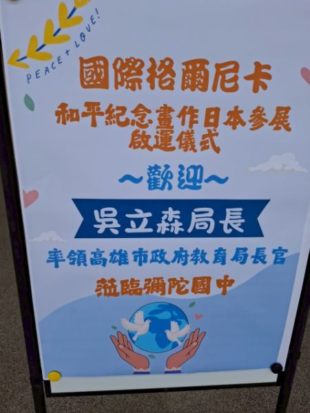 【漾新聞記者陳雯萍/高雄報導】臺灣首例!彌陀國中參與國際「兒童格爾尼卡藝術計畫」,創作畫作即將於7月啟運日本長崎和平紀念公園展出。高雄市政府教育局局長吳立森今(20)日親臨啟運儀式,盛讚學生以藝術詮釋和平、希望與人權價值,並祝福畫作順利展出、為臺灣發聲。