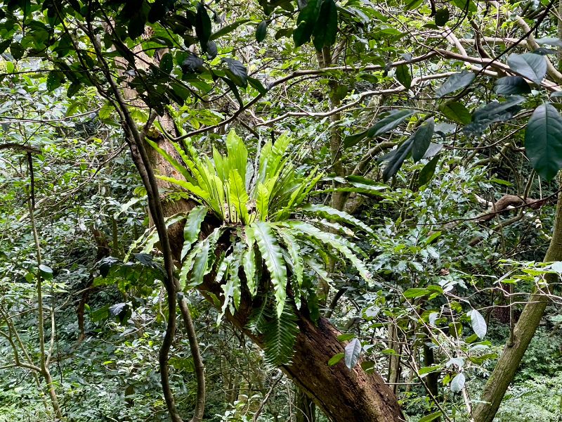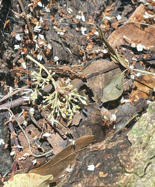 沿著G段原林古道往上攀行,山友們穿越密林與倒木,走過山豬出沒的林徑,腳下舖滿台灣光蠟樹細碎潔白的落花。昨日午後陣雨洗塵,今晨山稜清風徐來,綠意盎然、林蔭蔽日,令人暢快無比。一路行至1383公尺的南美瓏山三角點,再順勢下行,來到傳說中的「1314咖啡園」。