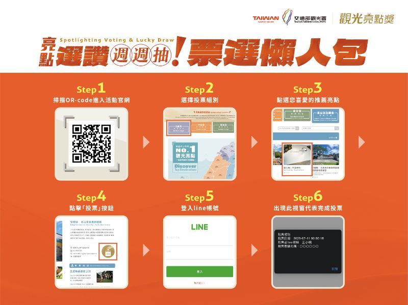 活動投票至7月31日止,每人每日可投兩票。為感謝民眾支持,高市觀光局加碼抽獎,獎品包括Apple iPad、28吋行李箱、高雄飯店住宿券與全聯禮券等,共15組超值好禮。提醒參與者務必加入「台灣觀光亮點」LINE官方帳號(https://line.me/R/ti/p/@256mrqxq),以接收中獎通知。活動詳情請至「觀光亮點獎」官網(https://spotlightaward.taiwan.net.tw/)查詢,更多高雄旅遊資訊請上「高雄旅遊網」網站(https://khh.travel/)或追蹤臉書(https://www.facebook.com/khh.travel)與IG(https://www.instagram.com/kaohsiung.bravo/)。