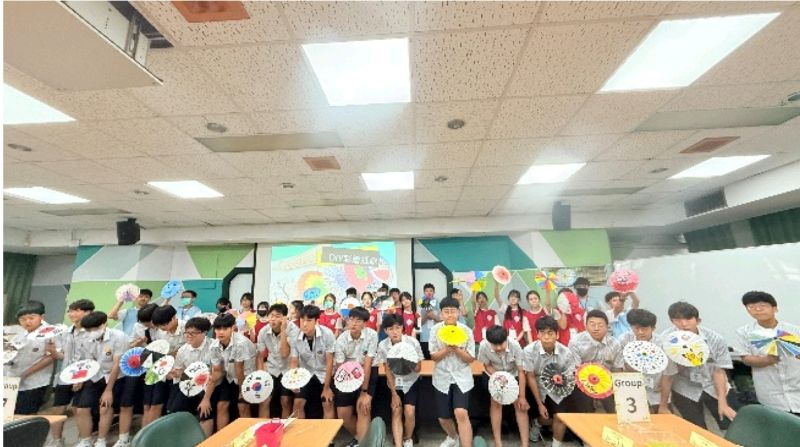 上午課程進行「DIY彩繪紙傘」活動,學生將傳統紙傘化作畫布,揮灑創意。韓國學生描繪台韓象徵與港都風情,民族學生在旁協助,雖語言不通卻默契十足。彩傘轉動間,成為兩校學生心靈共鳴的媒介,也畫下文化理解的彩色橋梁。