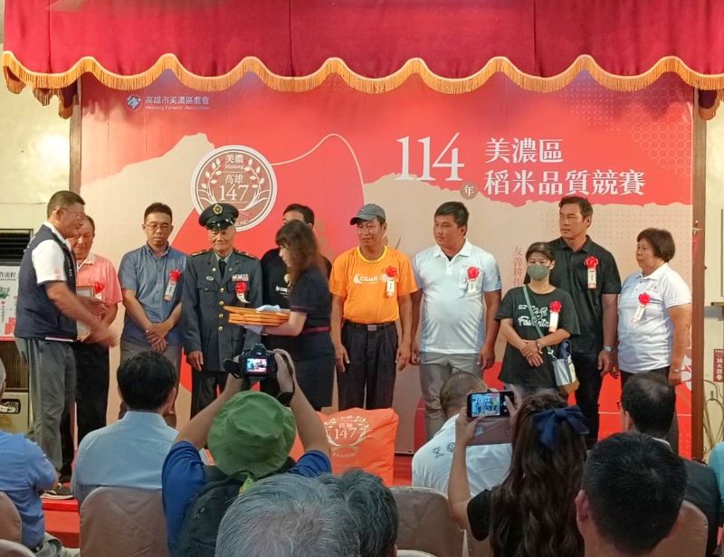 【漾新聞記者黃山高/高雄報導】農業部、農糧署、高雄區農改場、高市府農業局、高市農會指導濃區農會舉辦「114年美濃區稻米品質競賽」決賽,入選決賽的農友林金清、曾毅平、楊傅添妹、林佑興、巫璋貴、黃偉宸、涂貴田、張嘉霖、黃維志,最後由巫璋貴、黃偉宸獲選冠、亞軍,兩位代表美濃角逐全國殊榮。