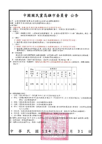 根據公告,高雄市本屆黨代表選舉名額共計179名,原黃復興黨代表名額亦納入整體計算。保障名額部分,包括婦女45名、青年18名、農民與漁民各3名、勞工4名、原住民1名、新住民1名及身障1名。相關資格認定與身份確認,將依公告辦法審核。