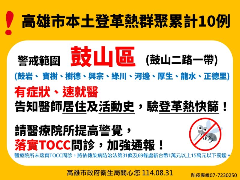 衛生局呼籲市民高度警覺,若出現發燒、頭痛、後眼窩痛、肌肉或關節痠痛、骨頭痛、皮疹等疑似症狀,應立即就醫快篩,並告知醫師活動與旅遊史,以利早期診斷。特別是腹部疼痛、持續嘔吐、牙齦出血、嗜睡、煩躁不安或意識改變等重症警訊,更應立刻送醫。衛生局也提醒醫療院所必須嚴格落實TOCC問診,對居住或活動於鼓山二路沿線、鹽埕區及三民中都一帶的疑似個案,務必依法即時通報。