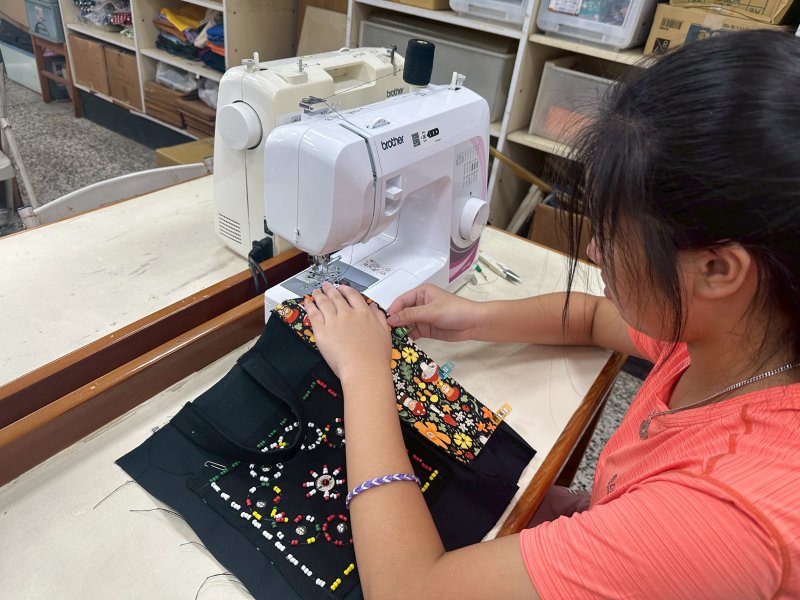這次合作別具巧思:多納學生創作出綴有太陽紋、雙尾蛇紋的刺繡作品,送交忠孝國小同學,再由他們以縫紉機縫製成布包,傳統與現代技藝就此合奏。