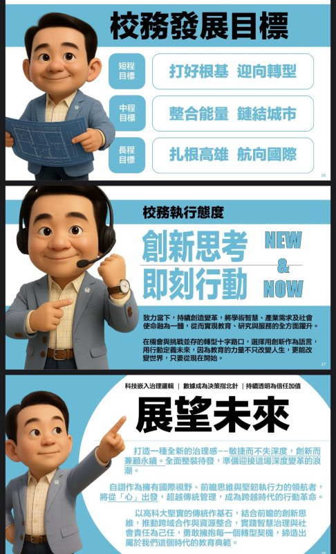 他同時也打造出「打好根基、迎向轉型」、「整合能量、鏈結城市」、「扎根高雄、航向國際」的短、中、長程校務發展目標。並能稟持「創新思考、即刻行動」的校務執行態度;展望未來,期能打造一種全新的治理感「敏捷而不失深度,創新而兼顧永續。」全面整裝待發,迎向高科大下一場深度改革的浪潮!