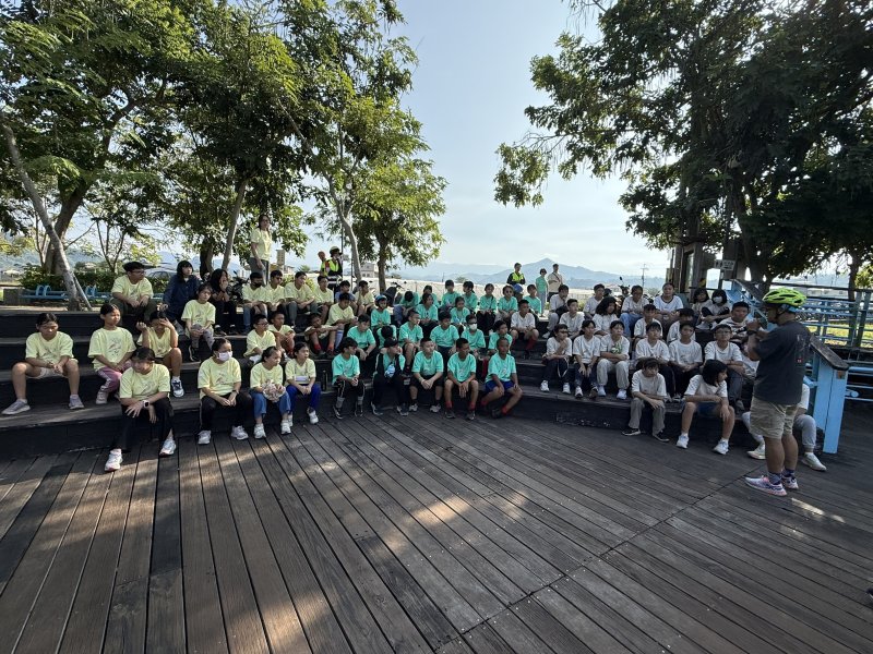 五忠班邱鼎荃一邊擦汗一邊說:「一開始我有點怕跌倒,但老師教我們看路況、慢慢起步,後來就越騎越穩!」五孝班宋安芮笑著補充:「我學會在轉彎前舉手示意,回家還提醒爸爸開車要禮讓行人。」五仁班徐允丰則難掩興奮:「騎在美濃湖畔,風很涼、心也開,覺得自己長大了!」