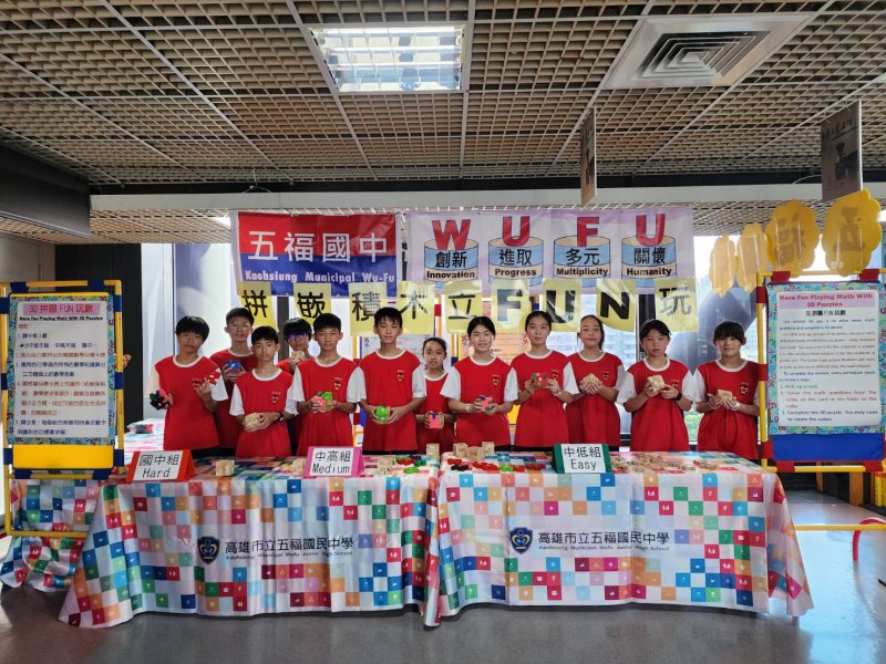 五福國中展攤主題為「拼嵌積木立Fun玩-Have Fun Playing Math With Cube Quest」,以國際雙語設計,結合SDGs第四項「優質教育」理念,落實園遊會「雙語、永續、科技」三大核心價值。此次展攤由梁益彰、余尚芸、梁淑嬪、蔡宜伶老師帶領一、二年級學生共同完成,從闖關流程到遊戲道具,全由師生在課餘及午休時間親手製作,充分展現團隊合作與創新精神。