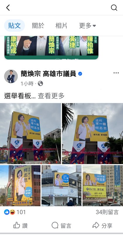而簡煥宗的留言,也因語帶調侃而引發網友熱烈討論。他以「童年回憶」的角度幽默開場,說自己看到新聞說柯志恩要在旗津掛看板,原以為會有地方限定設計,結果卻與市區版一模一樣,直言「好失望」。但他仍肯定柯志恩「用看板去酸柯文哲」的創意,笑稱「這句話真的很棒、也很酸」,並呼籲她「希望妳不要跟柯文哲一樣嘿」。他更打趣提到,看板上柯志恩背著背包,「希望妳是繞著高雄跑,不是隨時要烙跑」,讓網友直呼「酸得有梗」。