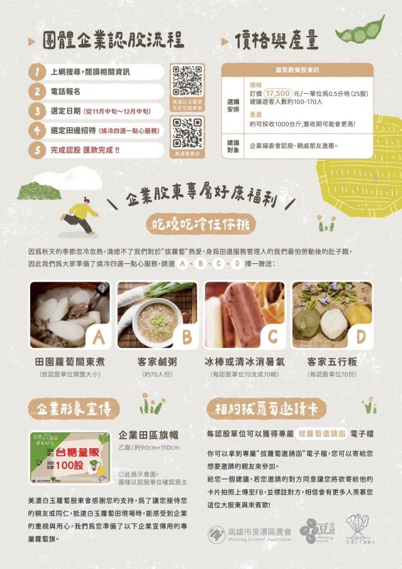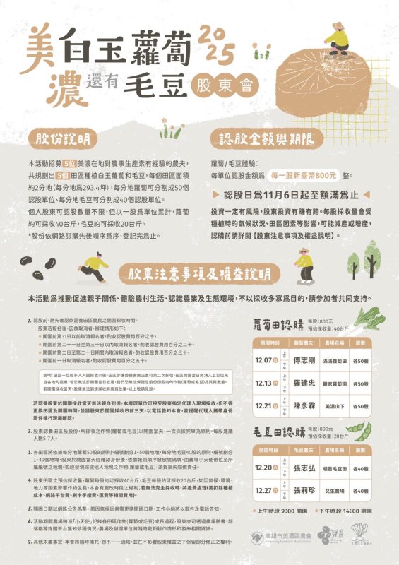 美濃區農會100年起推動「白玉蘿蔔與好豆股東會」,結合親子體驗、食農教育與在地共好理念,今年辦理白玉蘿蔔及毛豆股東認股,由5位具經驗農友分別5個田區規劃耕作,每分地白玉蘿蔔可分割50股、每股800元,約可採收30台斤;毛豆每分地40股、每股800元,約可採收20台斤。股東會活動11月6日上午10時於「美濃專賣店」官網準時開放報名,限量460股,售完為止。