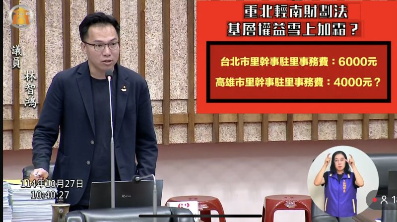 林智鴻痛批,高雄里幹事駐里事務費每月僅4000元,與台北6000元相比差距明顯。他指出,今年5月台北已通過調升鄰長工作費至每月3000元,最快明年上路,「比高雄多1000元」;而新北市也將自明年起替2萬多名鄰長納入團體意外保險,高雄卻尚未跟進,並直言:「財劃法修惡後,雙北更富、高雄更苦!」呼籲中央與地方都須正視南北差距正持續擴大。