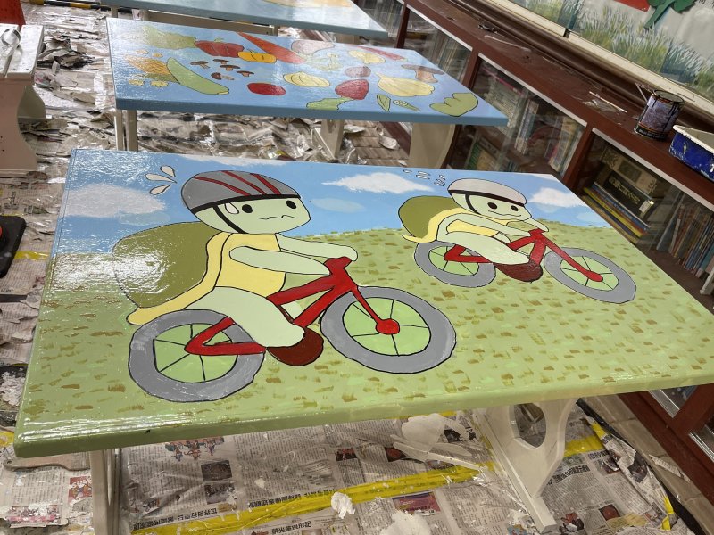 今年六龜國小校慶以「藝術翻轉校園」為主軸,老師攜手學生組成藝文團隊,自行申請計畫補助,從川堂的一張張老舊課桌椅開始改造。孩子們在課桌前揮動畫筆,為冰冷木桌重新注入生命,圖案中流露著校園願景、特色課程與在地記憶。從草圖、上色、補線到上透明保護漆,每個步驟都充滿認真與期待,彷彿親眼看著校園歲月被重新上色。