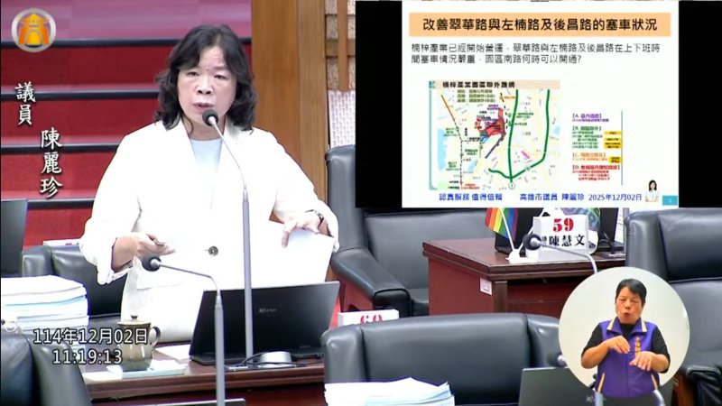 【漾新聞記者陳雯萍/高雄報導】長期關注北高雄交通與景觀改善的市議員陳麗珍,今(2)日上午於市政總質詢再度點名左楠多項交通黑點與步道整治延宕問題,包括蓮池潭東側步道、翠華路與左楠路潮車流、益群橋瓶頸、文智路35巷通行不便,以及多條主要幹道的人行道破損情形,要求市府加速改善、儘速提出具體時程。