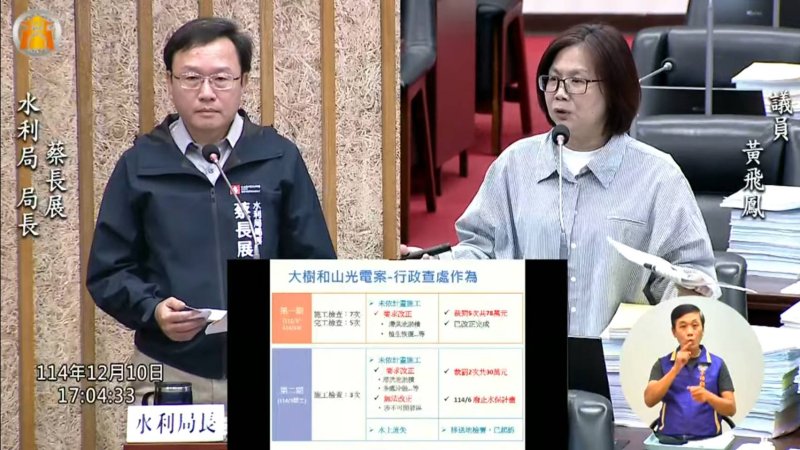 議員也關注大樹和山光電案後續。黃飛鳳要求市府追蹤中央許可進度,並對過度開發造成的水保疑慮提出因應;蔡金晏則要求表達反對立場並提醒外縣市垃圾處理量能影響,應及早研判可能引發的新廢棄物流向問題。湯詠瑜則建議市府思考運用法律「管收」概念因應無力繳罰者,並加強提醒土地出租風險,另要求提升聯合稽查設備與人力。