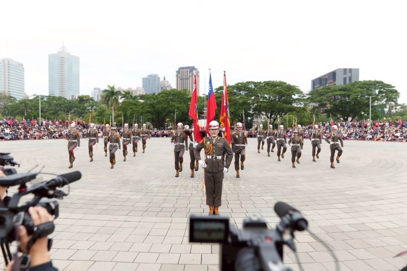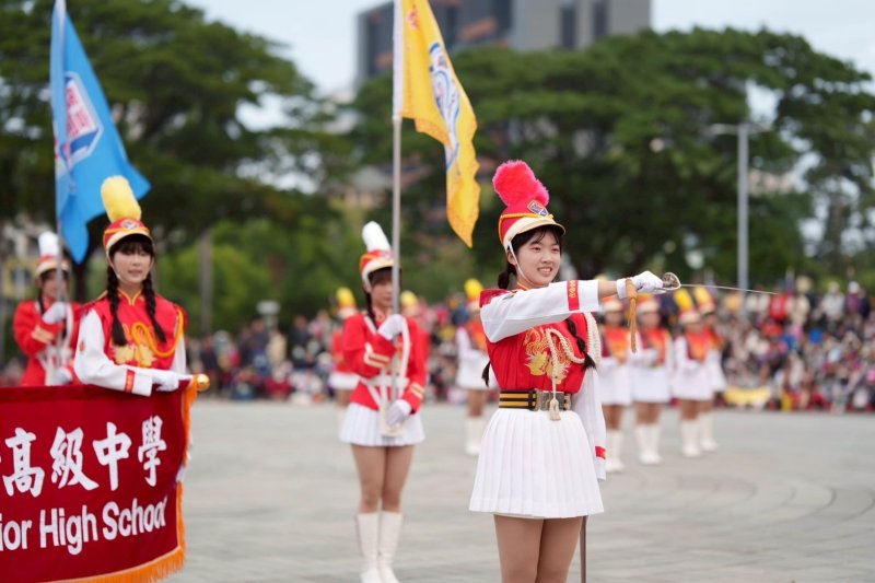 現場氣氛在升旗後逐步升溫,高雄女中樂儀隊、海軍陸戰隊操演及國軍寶寶演出接連登場,莊嚴與活力交織,讓清晨的廣場充滿節慶能量。迎接象徵奔騰與希望的丙午馬年,祈福儀式中,康裕成與陳其邁共同啟動象徵裝置,燈光閃耀間,為城市注入前行的祝福。