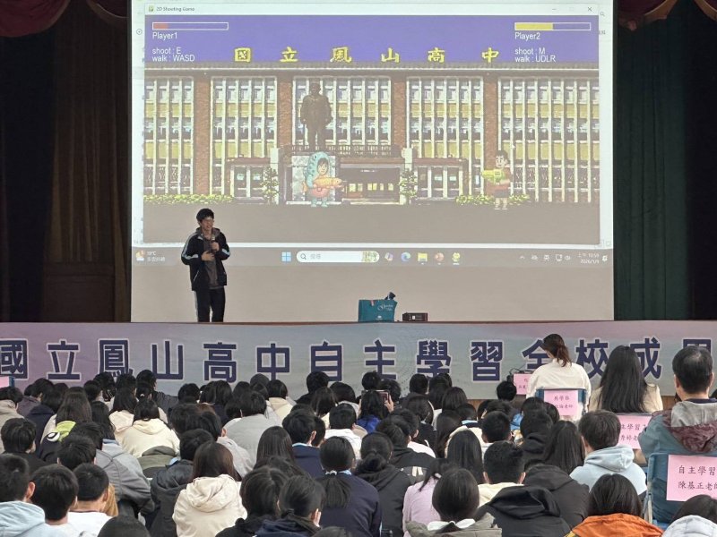 【漾新聞記者陳雯萍/高雄報導】為落實一○八課綱「自主學習」精神,高雄市立鳳山高中於九日上午十時,首度在校內中山堂舉辦高二學生「自主學習成果全校發表會」,現場集結近五百名學生與師長共襄盛舉。從程式設計、科學實作到語言與人文探究,多元成果輪番登場,其中以Python與Pygame遊戲設計奪下人氣票選第一名,掀起全場最高潮。