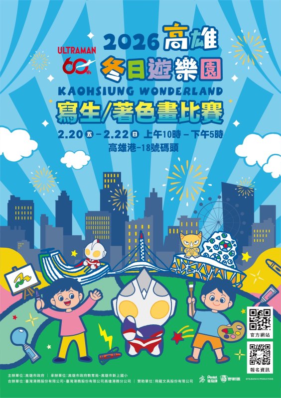 為深化活動的教育與藝術意義,高雄市政府教育局特別於2月20日至2月22日,在高雄港18號碼頭高雄旅運中心旁舉辦限定三天的「2026冬日遊樂園—寫生暨著色畫比賽」,每日上午10點至下午5點開放參與,邀請大小朋友揮灑創意,把心中最勇敢的超人畫進作品裡,與超人力霸王一起守護地球。