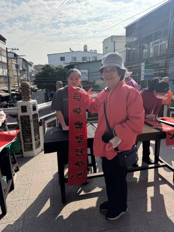 師生昨(24)日一早抵達威靈寺前佈置書桌與紅紙,隨著毛筆沾墨落紙,一副副春聯逐漸成形,學生們親手將作品遞到民眾手中,向長輩道賀、向鄉親送福。廟口人潮絡繹不絕,不少民眾排隊等候,也有人駐足欣賞運筆身影,年節氣氛在紅紙與墨香間緩緩鋪展。