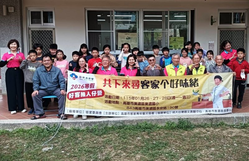 【漾新聞記者黃山高/高雄報導】客家委員會指導高雄市客家青年藝文協會於美濃國小舉辦「2026寒假。好客細人仔營-共下來尋客家好味緒」,岡大會創會長蔣榮欽和高市客青協理事長曾淑琪、總顧問蔡文章教授、張哲男校長、前理事長鍾旭華、總幹事邱麗君、常監傅喜招、理事鍾華緯,岡大會理事謝武強、副執行長李昌幸、副總幹事黃素燕等人到美濃國小,參加寒假客語文學營開業式。