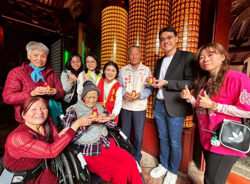 百歲失能的力鄂奶奶,罹患心臟病與腦血管堵塞導致需長期臥床,需靠家人照顧,華山基金會自114年起提供到宅訪視、年節關懷、物資協助等免費服務,透過定期陪伴與支持,減輕家庭經濟負擔、給予照顧者情緒支持,開場由小朋友幼兒園帶來新春舞蹈、蔡爺爺開心揮毫手寫春聯「華山濟世 悲憫孤老」祝福賀新春;旗山天后宮邀請8位長輩前往參拜點燈祈福,宮廟旁的鄭家陽春麵深受感動現場捐助孤老年菜三千元及參拜媽祖的民眾也捐款共計玖千元,伴手禮由盟承投資開發有限公司捐贈平安龜愛心米80份;目前獨老年菜尚待募集中,邀請大家一起愛老人。