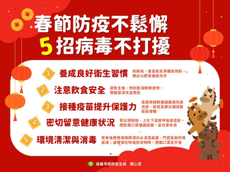 衛生局呼籲,春節期間民眾應避免前往擁擠或通風不良場所,與年長者或免疫力較低者接觸時建議佩戴口罩,若出現呼吸困難、急促或發紺缺氧等重症警訊,應立即就醫。防疫需要全民共同守護,讓高雄在團圓時刻,也能維持穩定而安心的健康防線。