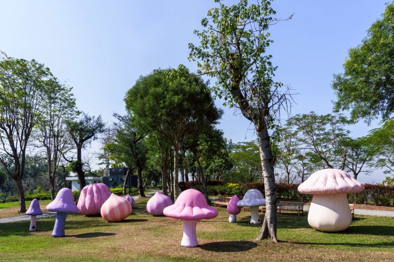 臺灣藝術家張騰遠以鳥瞰視角創作《鸚鵡模仿術-高爾夫球》,將高爾夫球放大近350倍,打造直徑12公尺的巨型裝置,背面隱藏其代表性的「鸚鵡人」臉龐,充滿幽默趣味。尹子潔則以桃花心木果實為靈感,打造《桃花果果開》、《菇菇屋》與《仙女圈》,宛如森林裡的祕密基地,吸引親子探索。