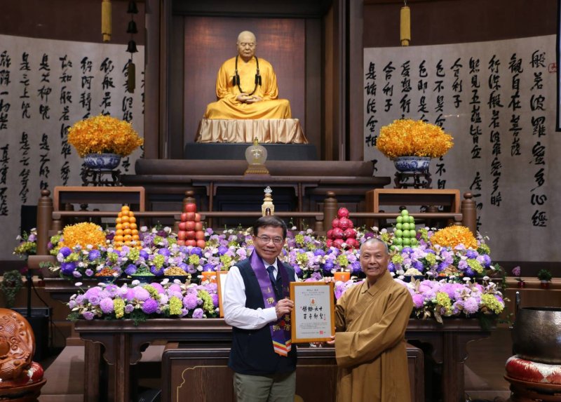 王國材回憶,約15年前因佛陀紀念館啟用而與佛光山結緣,今日見證紀念郵票發行格外殊勝。他也提到,大師曾書寫「中華郵政.服務第一」墨寶贈予當時的中華郵政董事長翁文祺,並表達希望未來能發行與佛光山相關郵票的心願,如今郵票問世,也象徵完成大師當年的願望。