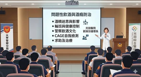 【漾新聞記者張茗富/台中報導】為關懷員警身心健康、強化正確紓壓觀念,臺中市政府警察局大甲分局於4日舉辦「問題性飲酒與酒癮防治」專題講座,邀請光田綜合醫院護理長劉小姐蒞臨授課,針對警察職場文化、輪班壓力與酒精代謝影響進行專業解析,協助同仁建立正確健康管理觀念。