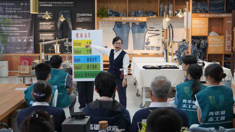 除了回收分類,志工團也走進鳳山靜思堂內的「丹寧織研所」,觀摩廢棄牛仔褲如何透過設計與加工,轉化為兼具美感與實用性的再生產品。從布料拆解到再製成品,每一道工序都展現資源再生的創意與可能,也讓青年看見循環經濟在生活中的具體實踐。
