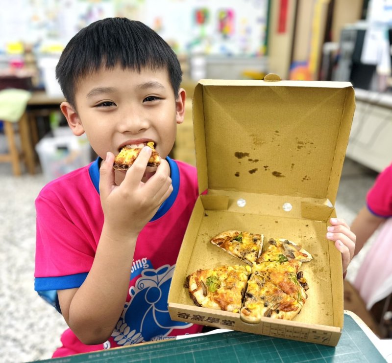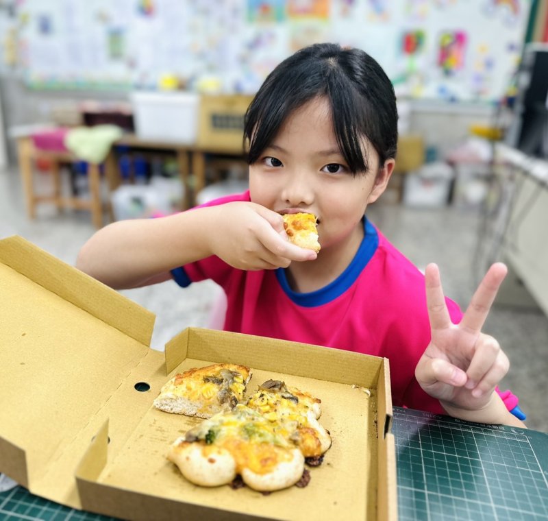 今年最受矚目的亮點,為「奇窯學堂」進駐校園指導Pizza手作體驗。學生親手揉製麵糰、鋪上配料,在窯烤爐中完成專屬披薩,現場香氣四溢,氣氛熱絡。新威分校學生吳承哲分享,看到披薩出爐的瞬間特別興奮,品嚐自己完成的作品更是滿滿成就感,成為難忘的兒童節回憶。
